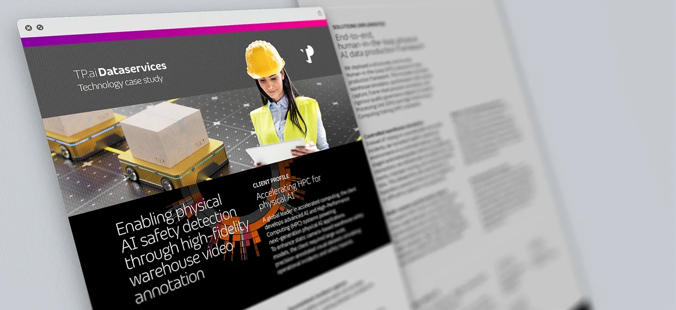 Working together with TP, the client built a human-in-the-loop data production framework designed to generate high-fidelity training data. Controlled warehouse simulations recreated complex safety scenarios, while synchronized multi-camera capture and frame-level annotation ensured precision and consistency across datasets. In just three weeks, the program delivered large-scale training data ready for GPU-powered AI models. The result: faster model development and more reliable detection of warehouse hazards in real time.