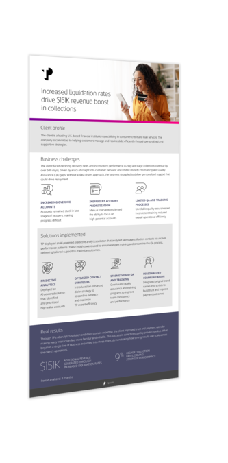 A U.S.-based credit and loan services provider faced stagnant recovery rates during late-stage collections. Partnering with TP, the client deployed AI-powered analytics to identify high-value accounts, optimize dialer strategies, and personalize communication. The improved insights and targeted training drove stronger liquidation and accelerated revenue growth across multiple lines of business.