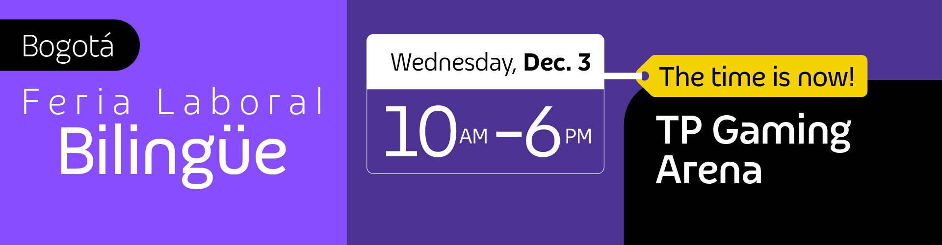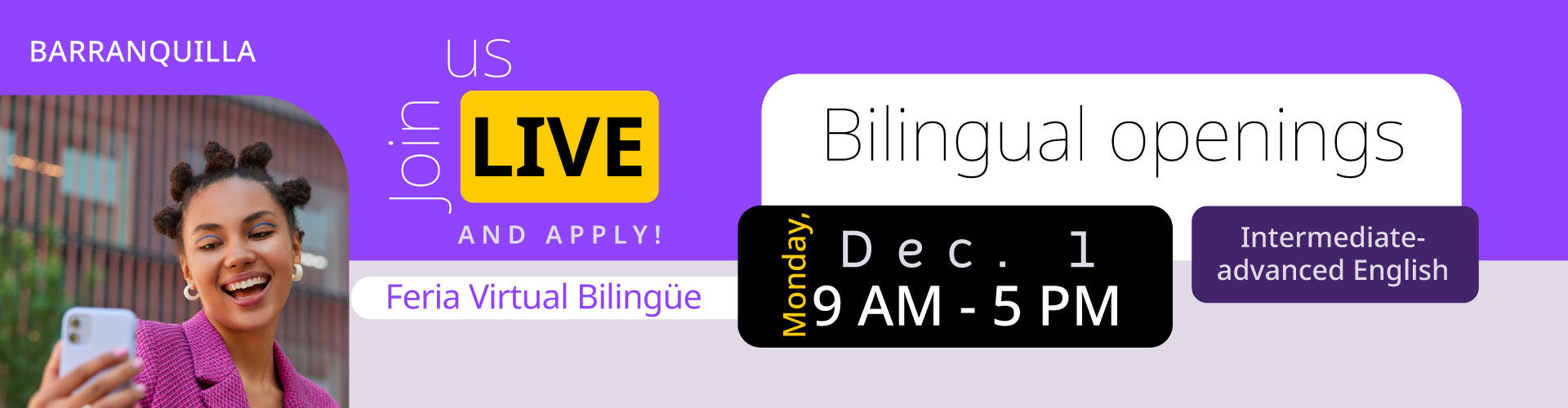 Our Feria Laboral Bilingüe will take place on Wednesday, December 3, from 10 AM to 6 PM.