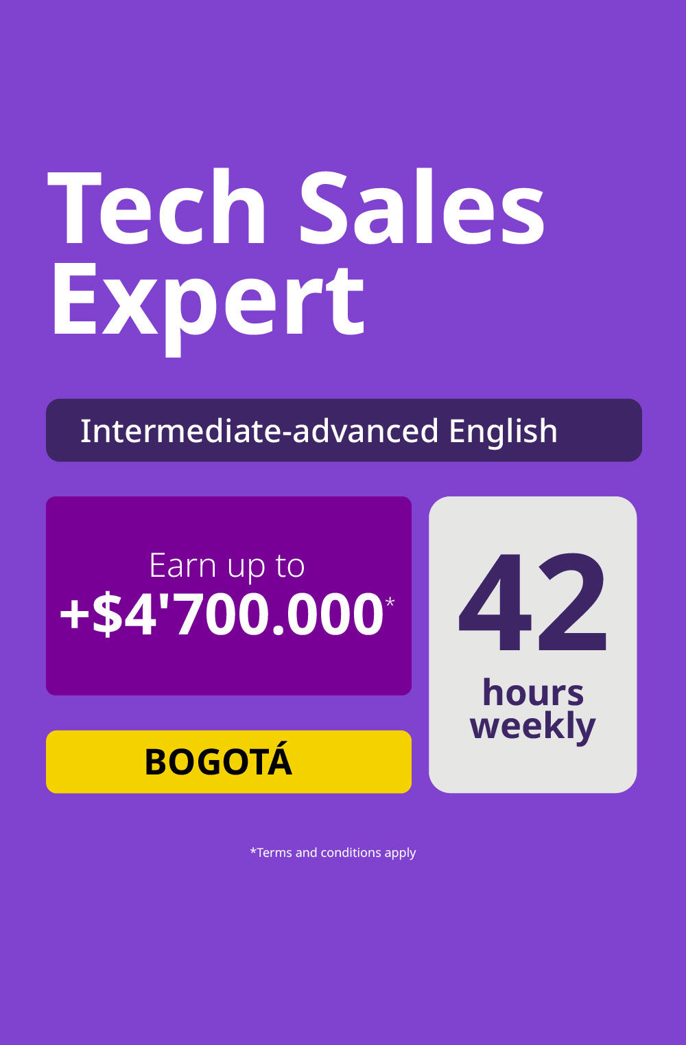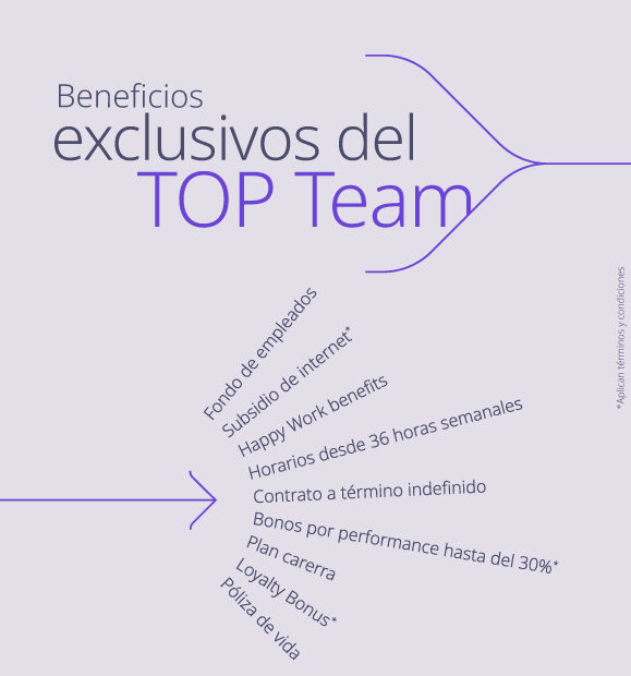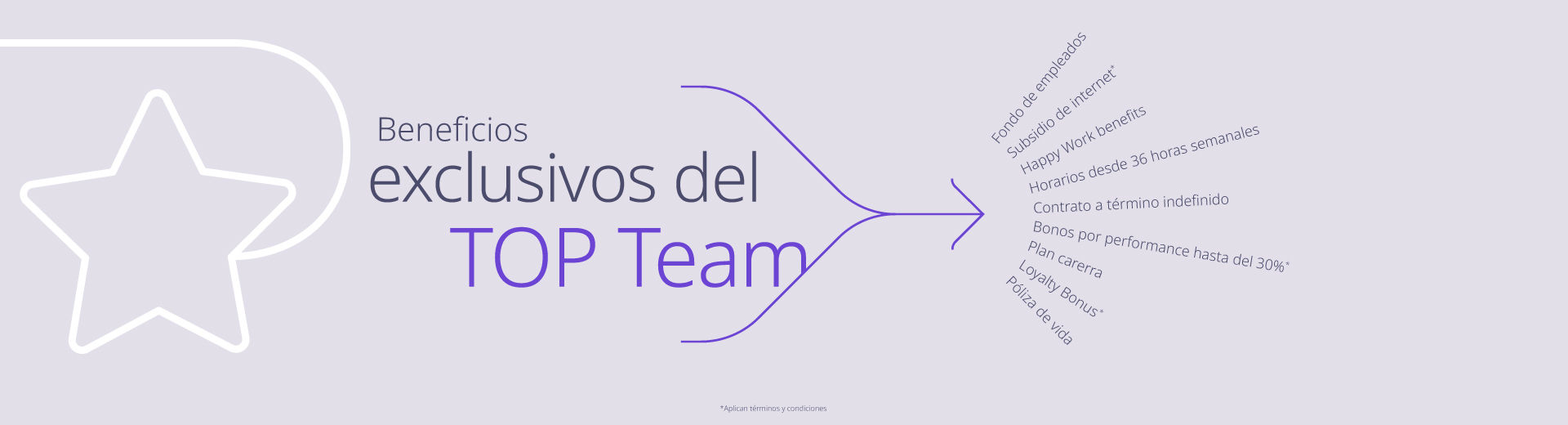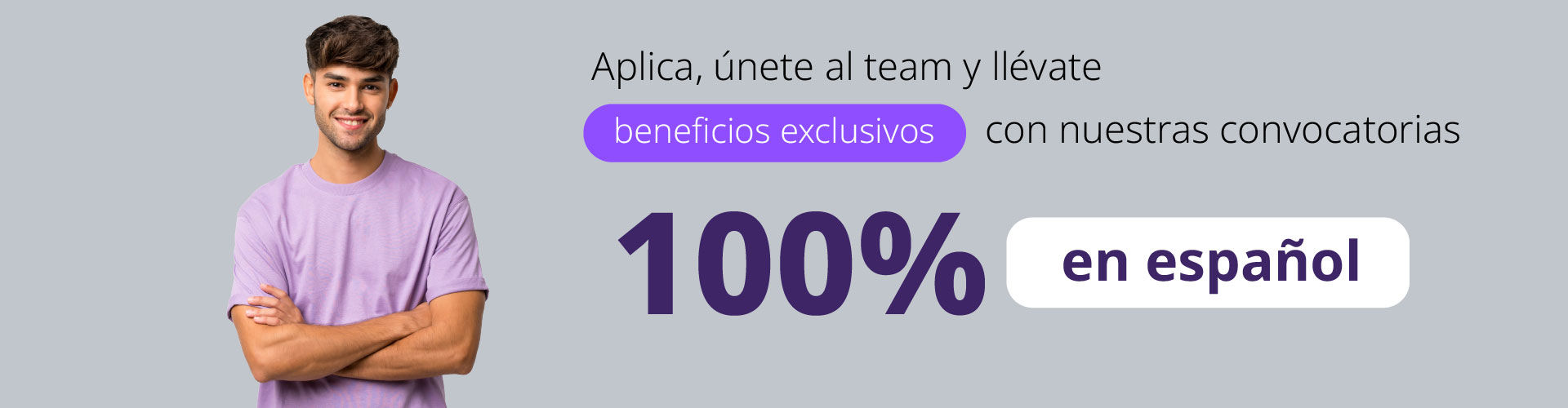 Aplica a nuestras convocatorias 100% en español y obtén beneficios exclusivos. Puedes ser parte del TOP Team si tienes perfil comercial o ventas.