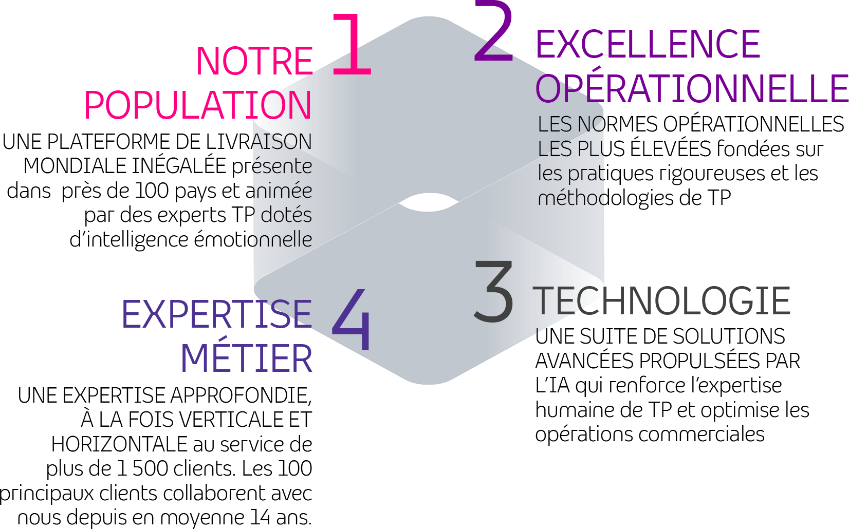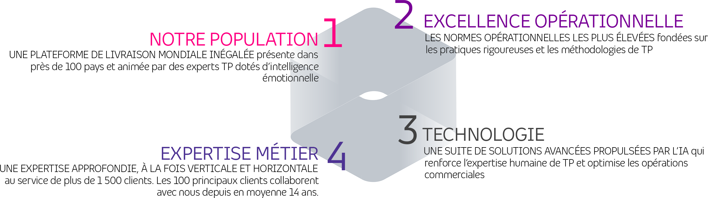 Notre approche unique à quatre dimensions crée un avantage concurrentiel pour nos clients et améliore leurs résultats commerciaux globaux.